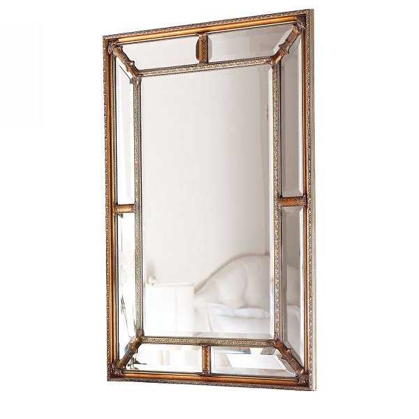 Узорчатая рама золотого цвета с растительными узорами по краям рамы, придает “Гарри” античный вид, а фацет по периметру всех зеркал создает глубину. Прямоугольная рама по внутренней части выполнена в золотом цвете, что придает настенному зеркалу элегантность, отлично гармонирующую с традиционным пространством.